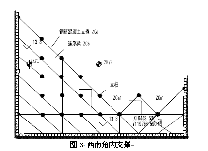 在基坑的東北角、東南角以及西南角設(shè)置有內(nèi)支撐(見圖3),內(nèi)支撐共有四道,支撐截面尺寸為1200mm×800mm與1200mm×1000mm,連系梁截面尺寸為800mm×600mm,混凝土等級均采用C25。