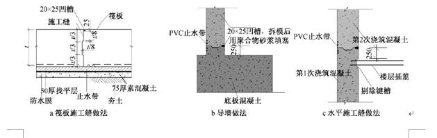 總之,通過留凹槽和剪斷水平鋼筋形成薄弱截面,通過增加止水帶來加強防水。