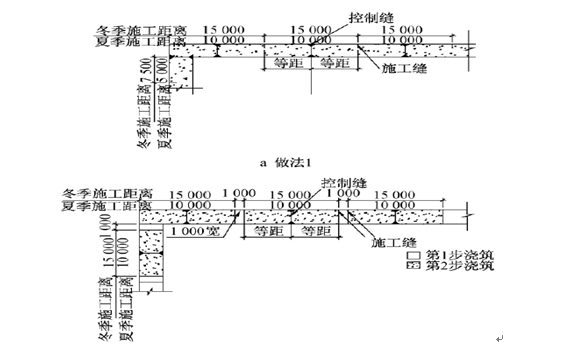 由于影響因素較多,理論上不好確定。目前,還沒有普遍能接受的方法來預測。但由于其受已澆筏板的約束,肯定比筏板的施工段短。根據(jù)經驗,此距離一般設為5~7.5m。但每次澆筑5~7.5m,則嚴重影響施工進度,并增加了施工縫處理工序。一般情況下,是把此距離擴大1倍,達到10~15m,并在其中部位置設置控制縫。所謂控制縫,就是在一個澆筑段的中部人為地制造一個薄弱面,當混凝土開裂時,引導裂縫出現(xiàn)在該部位。本工程施工圖紙要求的施工段間距為,冬季15m,夏季10m。同時,在每段中部設置控制縫。如圖1a所示。注意下段混凝土的澆筑與上段混凝土的澆筑時間間隔至少要差36h,以便上段混凝土充分收縮。當不能滿足該條件時,按圖1b設置后澆帶。