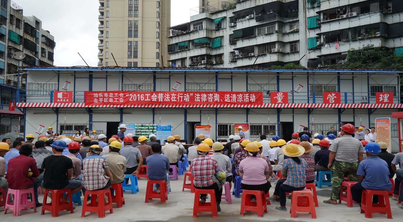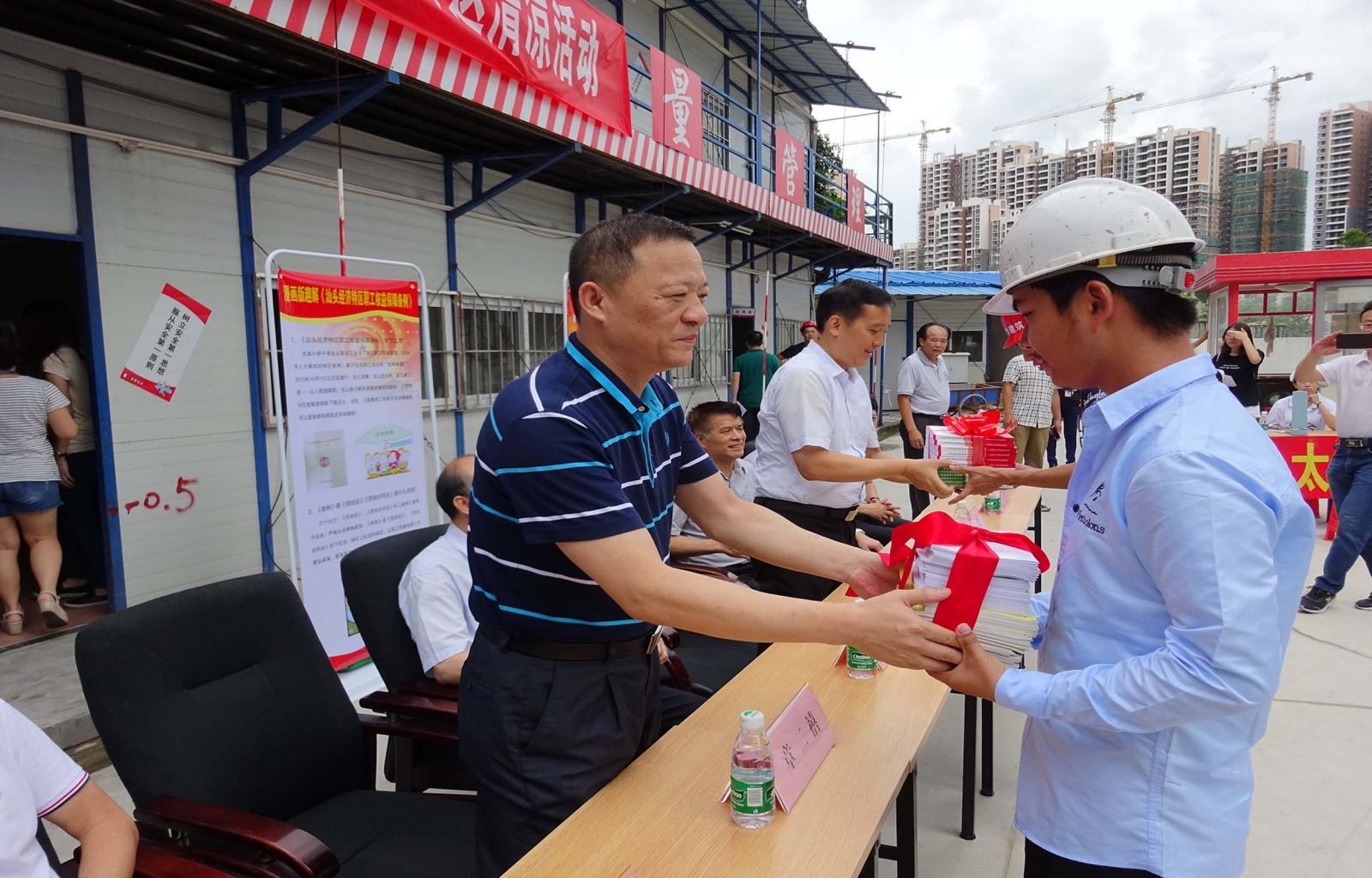 盛夏已到,高溫來襲,這給各行業(yè)作業(yè)人員帶來諸多的影響,尤其是奮戰(zhàn)在建筑施工現(xiàn)場的作業(yè)人員容易疲勞及中暑,為進一步關心現(xiàn)場作業(yè)人員的身心健康,汕頭市總工會、金平區(qū)總工會聯(lián)合我司于6月30號在建設項目施工現(xiàn)場舉行 “2016工會普法在行動”法律咨詢、送清涼活動。