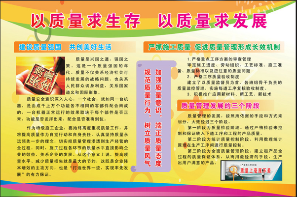 公司秉承“科學(xué)管理、創(chuàng)時代精品;誠信服務(wù)、讓客戶滿意”的質(zhì)量方針、“以質(zhì)取勝、信守合同”的企業(yè)精神以及堅(jiān)持“安全第一、預(yù)防為主、綜合治理”安全生產(chǎn)工作方針,加大對質(zhì)量、安全生產(chǎn)、文明施工的宣傳和管理力度, 切實(shí)消除質(zhì)量、安全隱患。全面貫徹落實(shí)上級行政主管部門文件的精神和要求,做好每月的定期、日常和節(jié)前節(jié)后的檢查工作、以及上級部署的各項(xiàng)專項(xiàng)檢查工作。