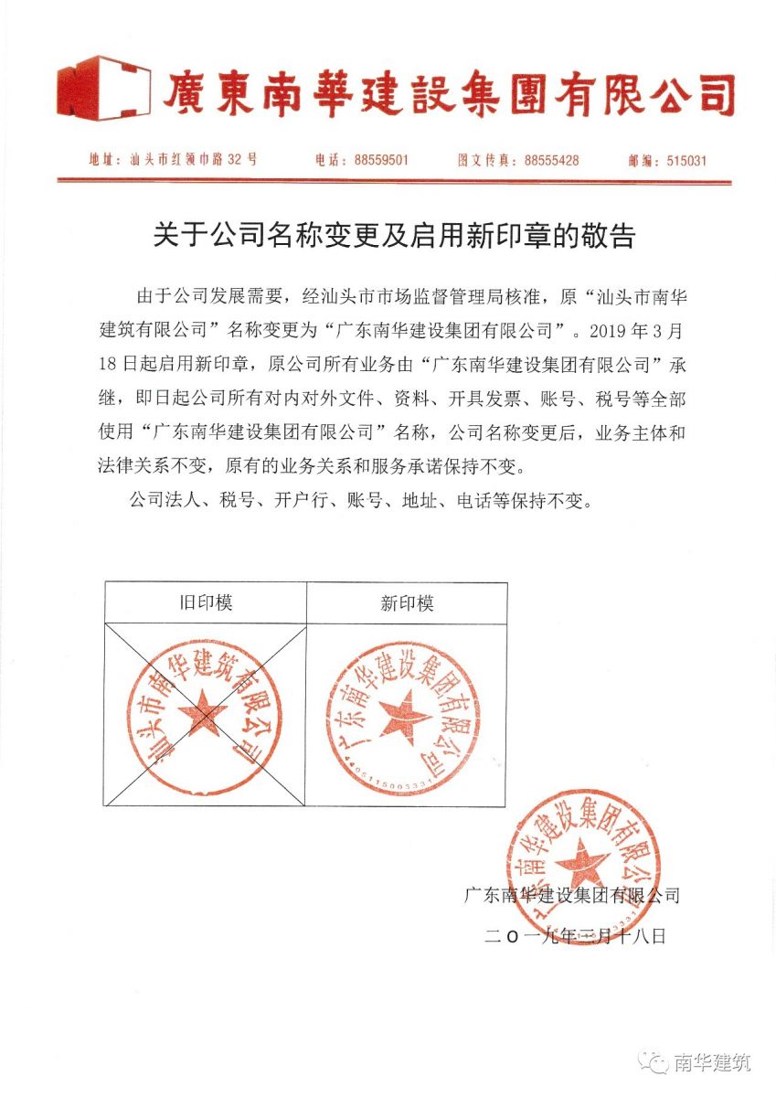 為實(shí)現(xiàn)公司戰(zhàn)略目標(biāo),滿足公司規(guī)?;l(fā)展要求,經(jīng)市場監(jiān)督管理部門核準(zhǔn),“汕頭市南華建筑有限公司”更名為“