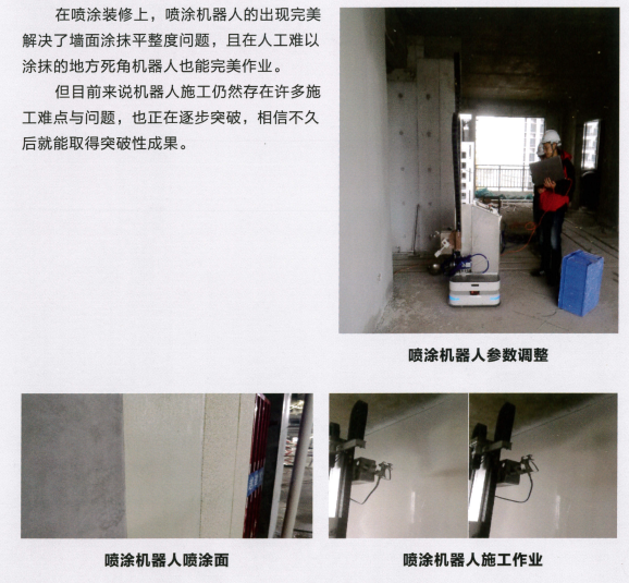 在墻面施工上,噴涂機器人取得成果較高。在通過墻板安裝機器人將墻板放置指點位置安裝后,需克服溫度、濕度、風(fēng)力、噴射強度等多種因素,完成底漆、中涂漆、面漆的均勻全自動噴涂作業(yè)。