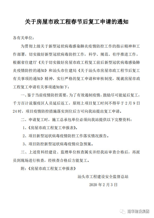 關(guān)于房屋市政建設(shè)工程春節(jié)后復工申請的通知