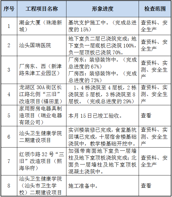 為強(qiáng)化建筑起重機(jī)械安全監(jiān)管工作,保障建筑施工安全生產(chǎn)形勢穩(wěn)定,根據(jù)汕頭市住建局文件通知,針對在建工程建筑起重機(jī)械安全專項(xiàng)檢查,我集團(tuán)公司予以積極配合,對各在建工程項(xiàng)目建筑起重機(jī)械進(jìn)行自查自糾,塔吊、施工電梯等起重機(jī)械設(shè)備的實(shí)體檢查、日常保養(yǎng)記錄、運(yùn)行記錄、交接班記錄、操作人員持證上崗、安全交底及定期保養(yǎng)情況均能按規(guī)定要求落實(shí)實(shí)施,確保使用安全。
