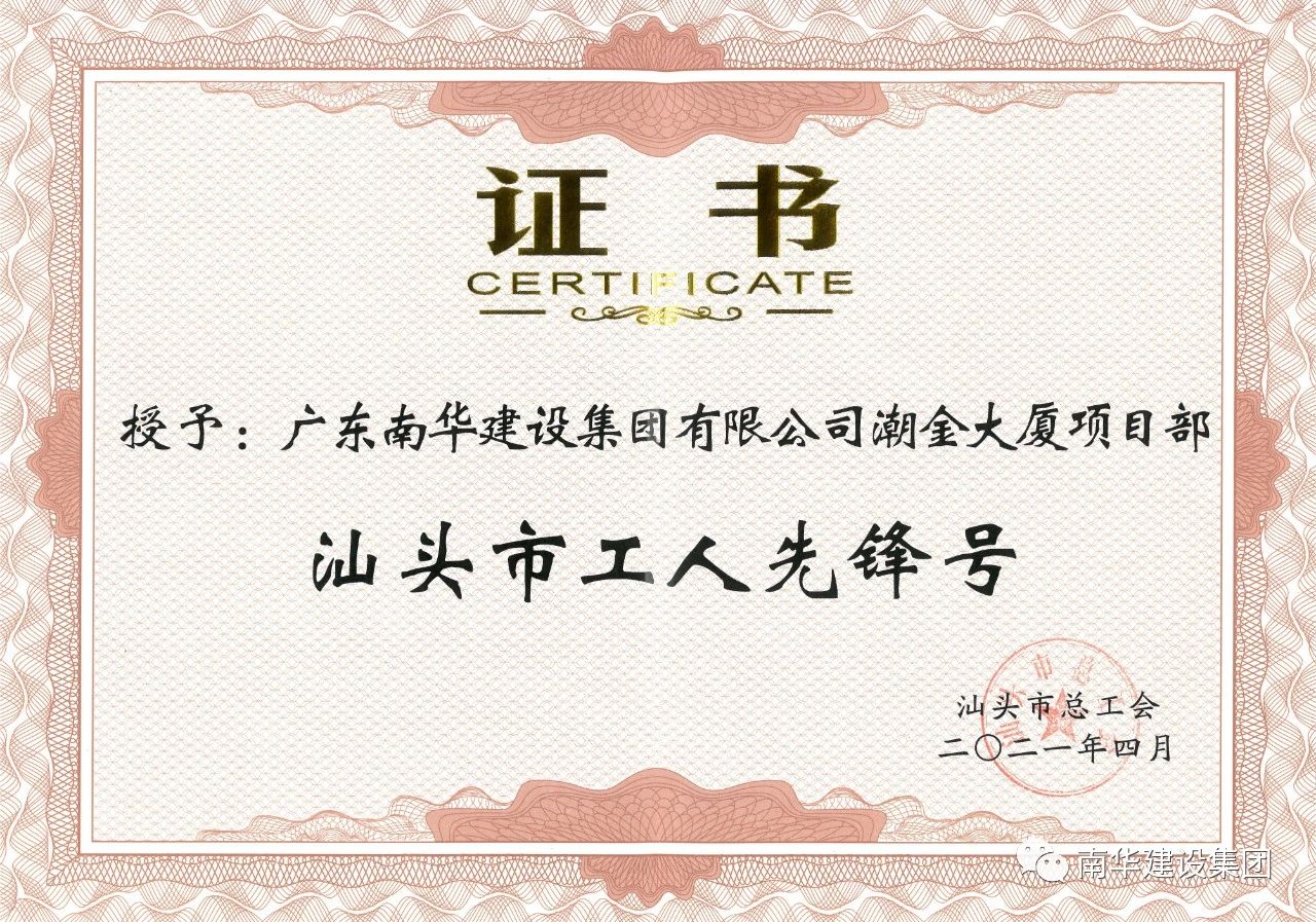 “五一”國際勞動(dòng)節(jié)來臨之際,4月30日下午,市委市政府在市委會(huì)議中心大會(huì)堂召開汕頭市慶祝“五一”國際勞動(dòng)節(jié)大會(huì)。南華建設(shè)集團(tuán)“潮金大廈項(xiàng)目部”榮獲汕頭市 “工人先鋒號(hào)”稱號(hào)!潮金大廈項(xiàng)目部在公司領(lǐng)導(dǎo)班子和公司工會(huì)的帶領(lǐng)下,一直秉承“科學(xué)管理、創(chuàng)時(shí)代精品;誠信服務(wù)、讓客戶讓客戶滿意”的質(zhì)量方針與“以質(zhì)取勝、信守合同”的企業(yè)精神,以精細(xì)化管理規(guī)范自己,以標(biāo)準(zhǔn)化建設(shè)要求自己,團(tuán)結(jié)奮進(jìn),銳意改革,狠抓建筑質(zhì)量與優(yōu)質(zhì)服務(wù),高效完成各項(xiàng)生產(chǎn)工作任務(wù)。2020年2月獲“汕頭市合格職工之家”稱號(hào),2020年7月獲“汕頭市金平區(qū)先進(jìn)集體”稱號(hào)。