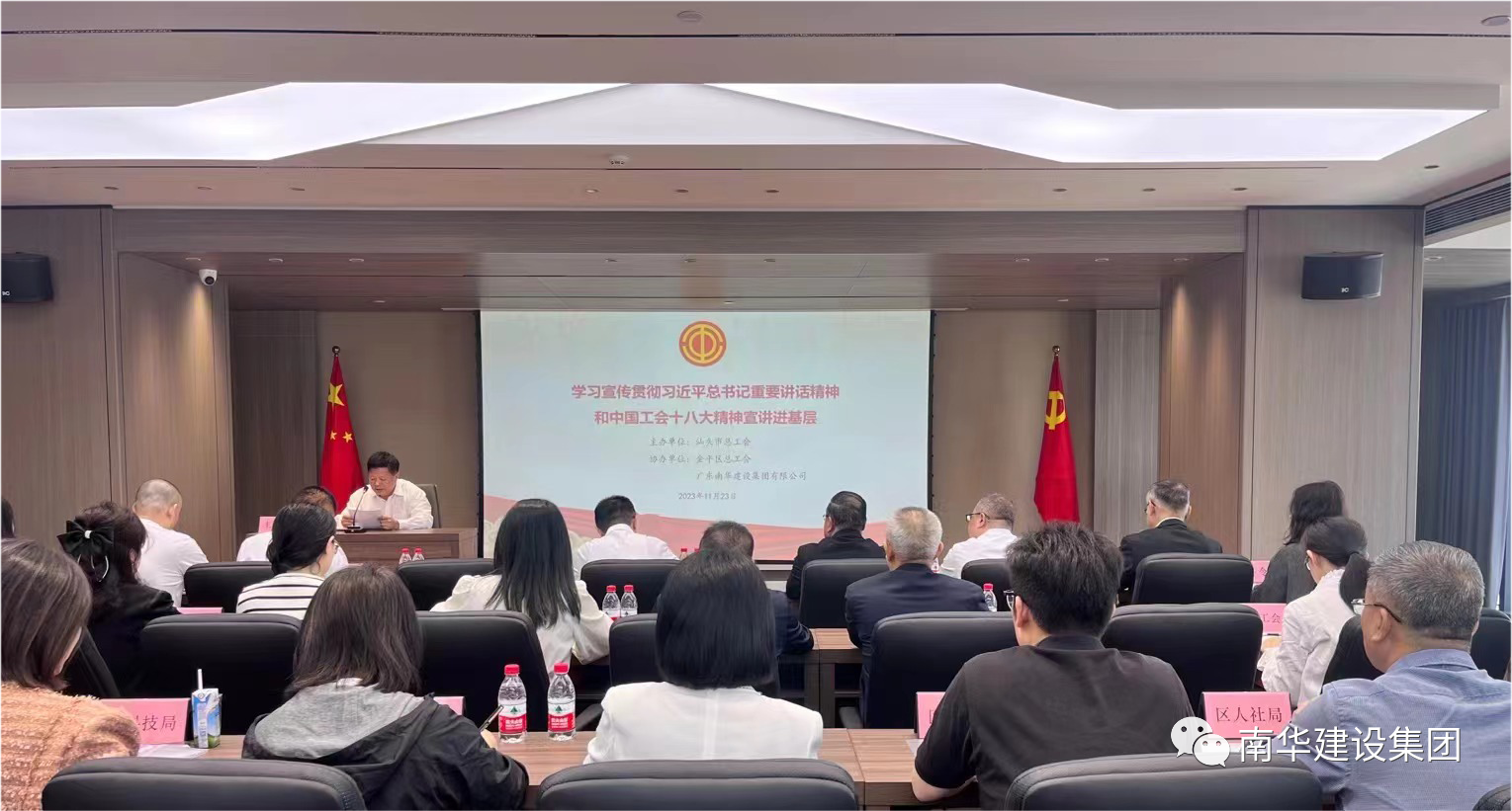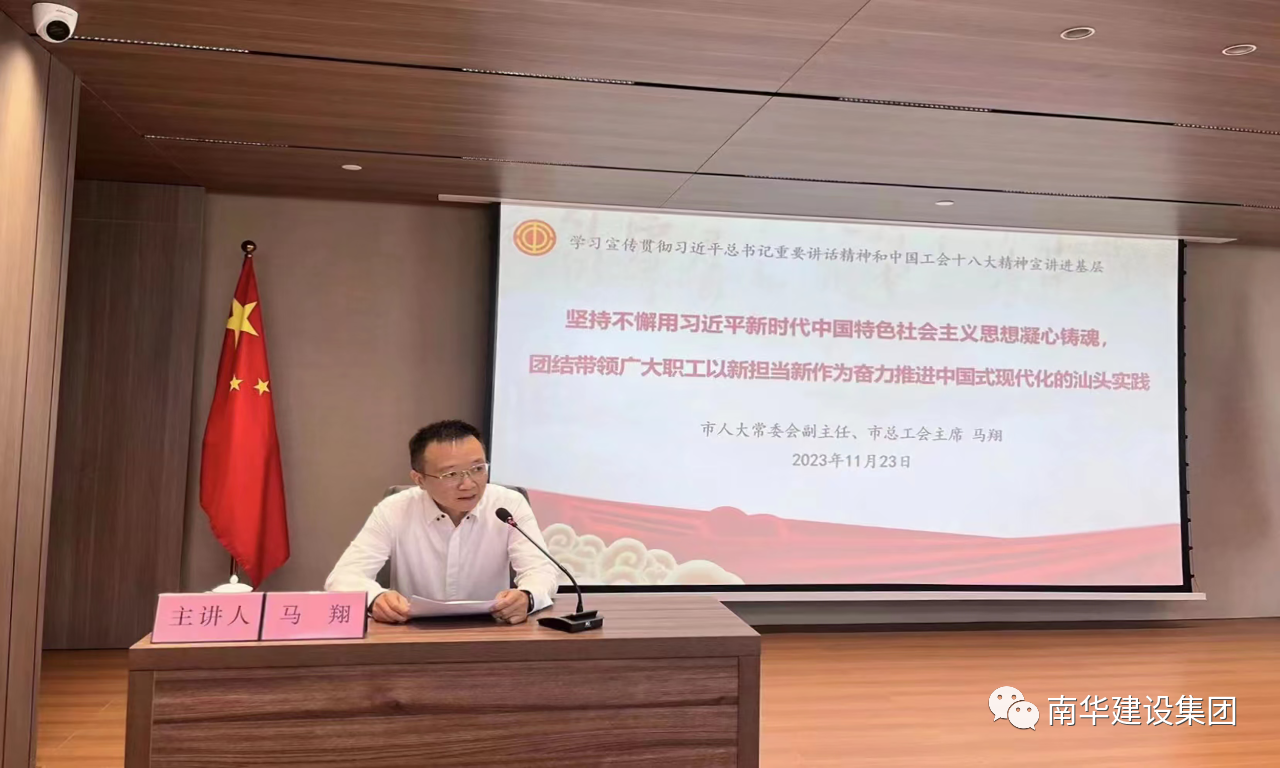 為深入學(xué)習貫徹黨的二十大精神以及習近平總書記同中華全國總工會新一屆領(lǐng)導(dǎo)班子成員集體談話時的重要講話精神,認真貫徹落實中國工會十八大精神,切實用以武裝頭腦、指導(dǎo)實踐、推動工作,更好引領(lǐng)廣大職工群眾聽黨話、跟黨走,以實際行動助力工會工作高質(zhì)量發(fā)展。11月23日上午,由汕頭市總工會主辦、金平區(qū)總工會協(xié)辦的學(xué)習貫徹習近平總書記重要講話精神和中國工會十八大精神主題宣講活動在廣東南華建設(shè)集團有限公司舉辦,市人大常委會副主任、市總工會主席馬翔出席活動并作專題宣講,市、區(qū)總工會有關(guān)領(lǐng)導(dǎo)同志及我市的中國工會十八大代表、工會干部和職工代表參加學(xué)習。
