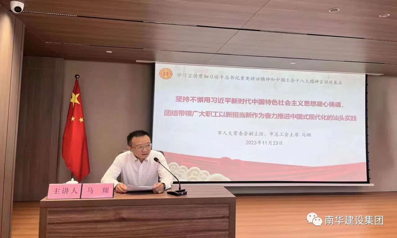 11月23日上午,由汕頭市總工會主辦、金平區(qū)總工會協(xié)辦的學(xué)習(xí)貫徹習(xí)近平總書記重要講話精神和中國工會十八大精神主題宣講活動在廣東南華建設(shè)集團有限公司舉辦,市人大常委會副主任、市總工會主席馬翔出席活動并作專題宣講,市、區(qū)總工會有關(guān)領(lǐng)導(dǎo)同志及我市的中國工會十八大代表、工會干部和職工代表參加學(xué)習(xí)。南華建設(shè)集團作為金平區(qū)產(chǎn)業(yè)工人隊伍建設(shè)試點企業(yè),在市、區(qū)總工會的指導(dǎo)下,公司密切結(jié)合企業(yè)實際,以黨建帶工建,工建促黨建,凝聚廣大職工力量,匯集廣大職工智慧,把企業(yè)建設(shè)成一個“和諧發(fā)展、廉潔高效”的堅強團隊。我們要認真學(xué)習(xí)宣傳貫徹好習(xí)近平總書記重要講話精神和中國工會十八大精神,充分發(fā)揮工人階級主力軍作用,大力弘揚勞模精神、勞動精神、工匠精神,以實際行動推動公司走好高質(zhì)量發(fā)展之路。
