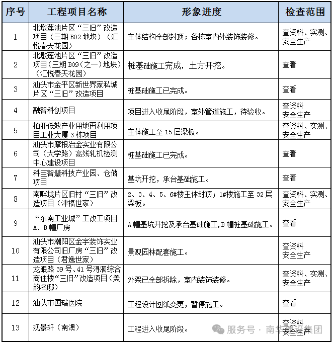 根據(jù)《汕頭市住房和城鄉(xiāng)建設(shè)局關(guān)于開展歲末年初住建領(lǐng)域安全生產(chǎn)工作督導(dǎo)檢查的通知》的要求,深入貫徹落實(shí)習(xí)近平總書記關(guān)于安全生產(chǎn)的重要指示精神,牢固樹立“紅線”意識(shí)、“底線”思維和“首位”要求,認(rèn)真落實(shí)省委省政府、市委市政府關(guān)于安全生產(chǎn)工作各項(xiàng)部署,針對(duì)歲末年初行業(yè)安全防范規(guī)律和特點(diǎn),督促各在建項(xiàng)目落實(shí)落細(xì)安全生產(chǎn)工作措施,堅(jiān)決遏制各類安全生產(chǎn)事故的發(fā)生,確保歲末年初安全生產(chǎn)形勢穩(wěn)定。